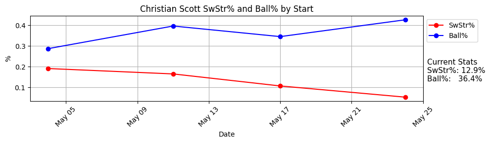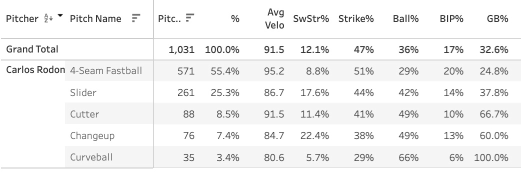 So for the season now it’s a 12.9% SwStr% and 36.4% Ball%, and to his credit he did not give up much hard contact at all here. He managed well and ended up with a pretty good box score line, but you can see the SwStr% has gotten worse every outing so far, and a couple more starts without whiffs is going to make me bail on the guy.
