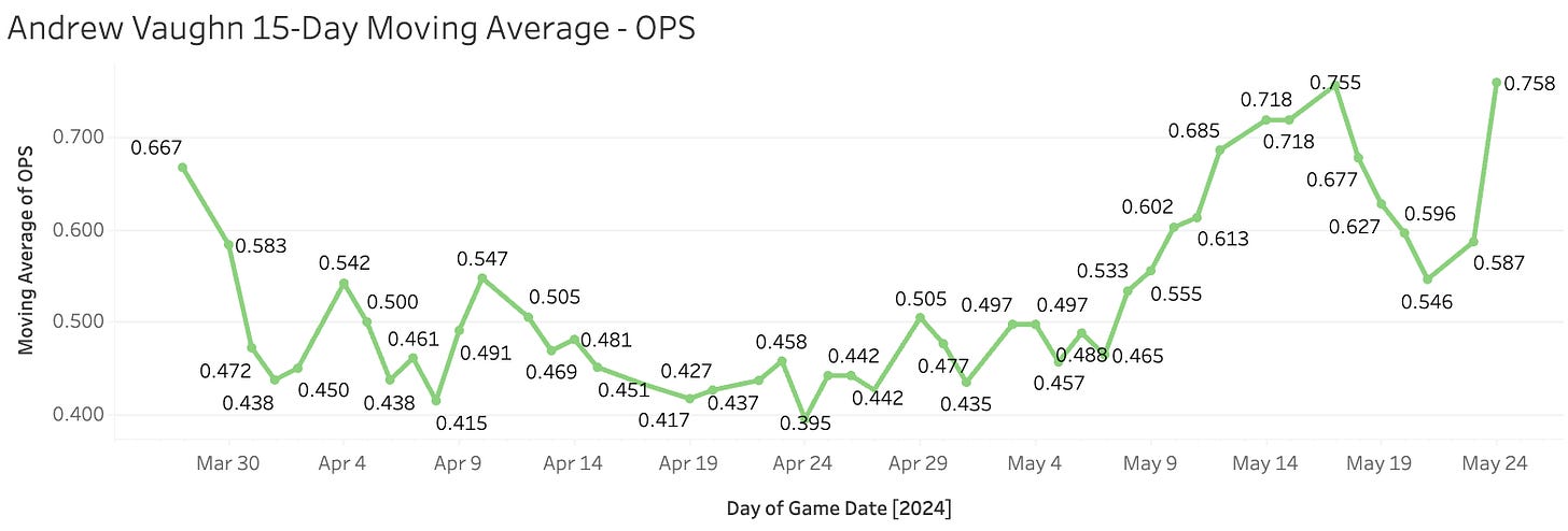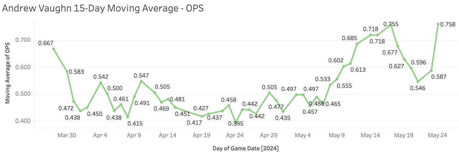 All four of his homers this year have come in the last two weeks and he’s slashing .224/.296/.510 over that time, so it’s empty power, but at least it’s better than before when he was just empty. If you remember back to 2019-2021, this guy was one of the top hitting prospects in the league, and that hasn’t gone anywhere to this point and now he’s 26, so we’re running out of time. But Vaughn can and will be better than what he showed you in April, and he still should be rostered in like 16-team leagues.