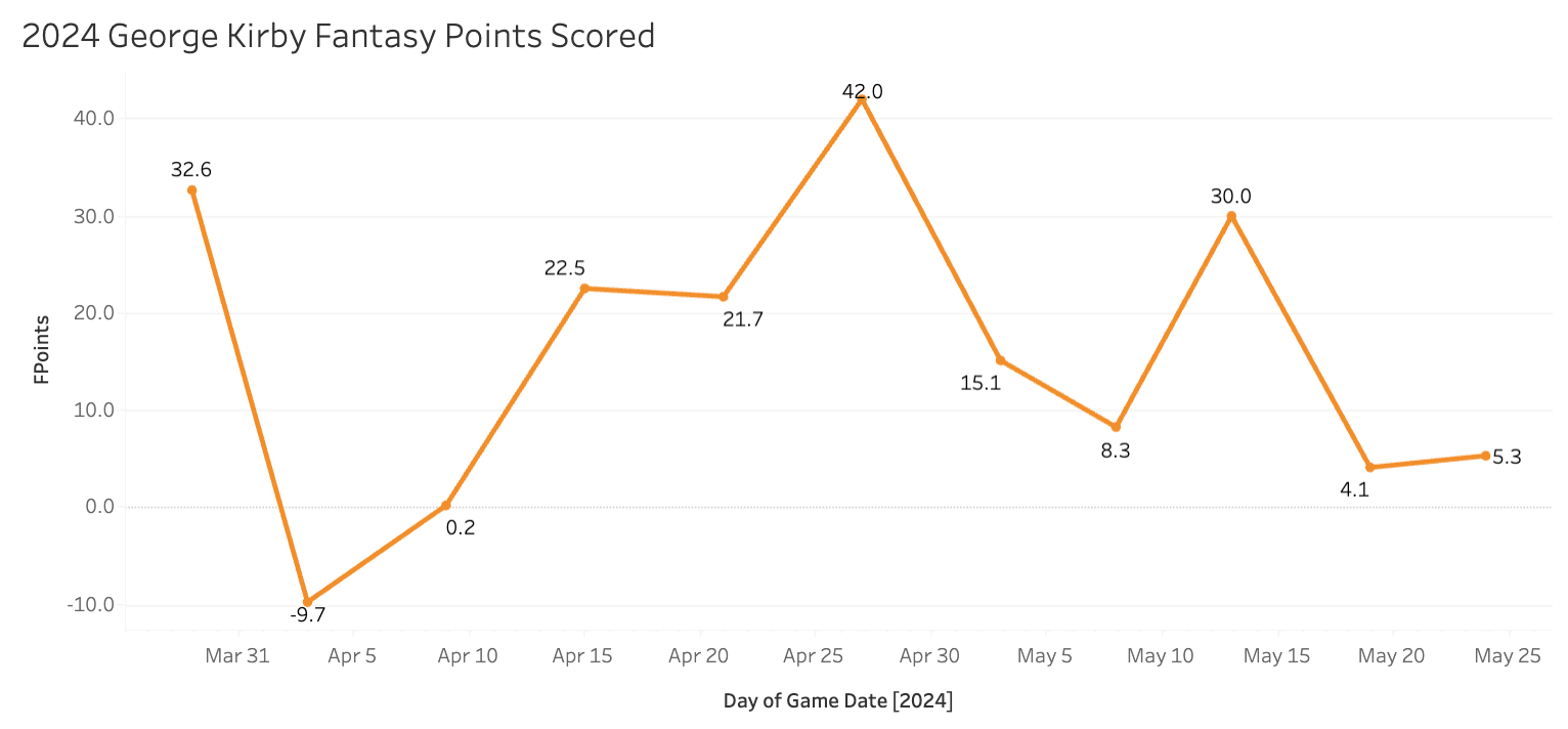 This is what you get when you cannot consistently deliver strikeouts. Depending on soft contact and your fields making out is risky business. The 12.3% SwStr% and 22% K% are right at the league averages. He walks batters a ridiculous 2% of the time, so that helps limit the damage when hits do occur, but I would say it’s time for Kirby to go for more strikeouts. If he’s this good at throwing the ball where he wants, he could easily just intentionally work out of the strike zone a bit more to get a few extra chases and whiffs which would lead to strikeouts. He can probably just go for a 6% BB% and raise the K% to 26-27% with how good his stuff is. So that’s my advice to you, George.