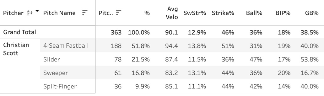 This was a really bad start by all of the numbers I constantly cite here, and that’s a concern. The Giants are a tough team to strikeout (21%), and they’re in the best-10 in chase rate as well, but I’m sure Scott didn’t actually want to throw this many balls with so few whiffs.