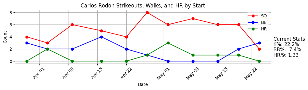 The numbers are still fine, but we’ll watch closely moving forward. He is nowhere near the league leaders in terms of raw stuff, so he has a steeper hill to climb to get to the level of consistently getting big league hitters out.