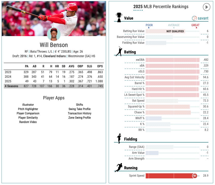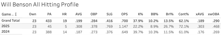 Definitely some interesting names there to look into adding. I wouldn’t do it on Will Benson, by the way. I’ve been down that road before. He is the classic “swing out of your freaking shoes and hope for the best” profile. And that kind of thing will turn into some stretches where he crushes. But it will always kill you in the end.