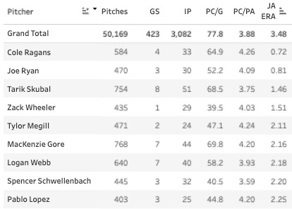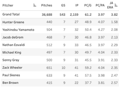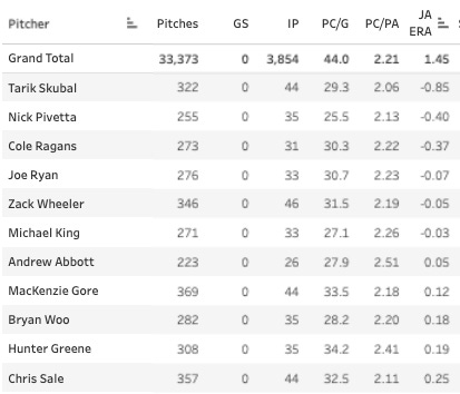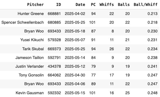 Not bad, but you do see some losers like Kyle FreelandandZack Littell sneaking in there. One way you can post a low ball rate is just by giving dudes easy pitches to hit all of the time. And that’s pretty much what Freeland does. It can turn into good outings if the hitters don’t take advantage of the pitches, but it’s generally not a recommended strategy.