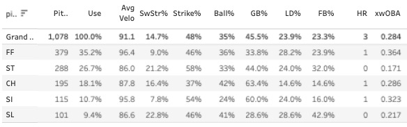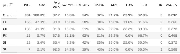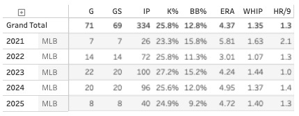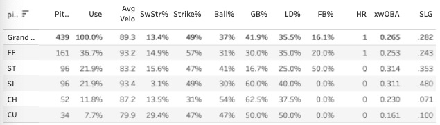 It’s still not blowing me away. The SwStr% is very good but not to the elite levels that really make your eyes open - and the ball rate is kinda bad and he doesn’t get many ground balls, which is a problem as a righty in Yankees Stadium half of the time. But again, it is hard to argue with a 36% K% over a five-start sample. And it’s even harder to argue with a 21.6% K-BB% on the season.