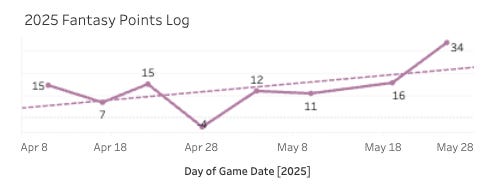 He hits the ball hard (107.6 EV90, 14.6% Brl%, 111 max EV). This is probably just a streak of him running into the ball at an unsustainable rate - but he does look like a good target in a two-catcher league, and he’s someone to keep an eye on.
