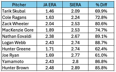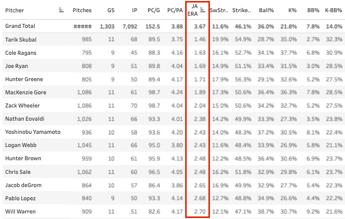 It’s a good opportunity to show you that I added a SIERA-like stat to the main dashboard last night. I was trying to replicate SIERA, so I asked a robot to do it for me. What the robot came up with doesn’t match, but it uses the same components and general calculations as SIERA, so it should work the same. I’ve called it “JA ERA”, which is a bad name. But not everything can be good.