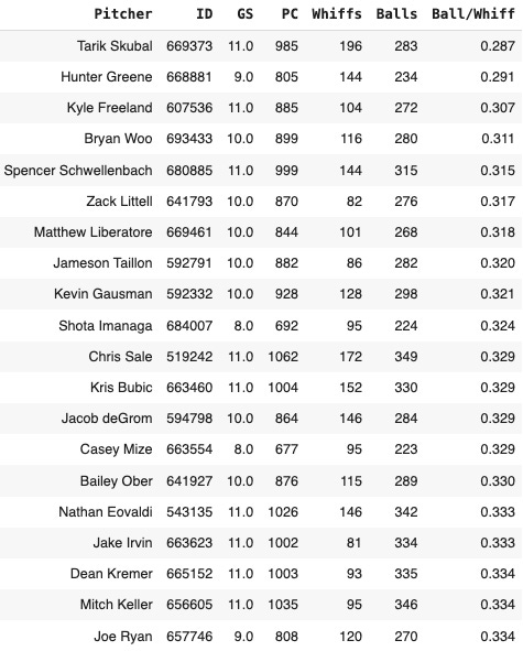 This represents the “SwStr% + Ball% Magic Formula” thing I do pretty well. Let’s look at the top 20 for the season: