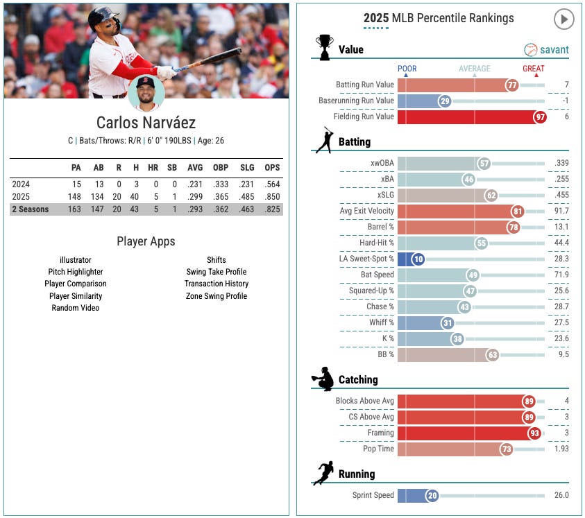 Let’s look at some hot hitters. I’ve been seeing Carlos Narvaez’s name pop up quite a bit lately. He’s a Red Sox catcher who looks like an elite defender, and he’s been hitting the ball as well.