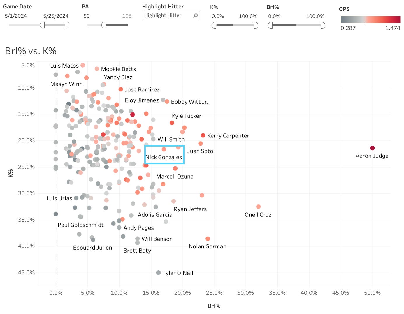 Nick Gonzales has 14 RBI in 61 PAs now with a .903 OPS after another good game yesterday. He is fourth in the league in RBI since debuting and the .903 OPS is obviously fantastic. The K% is down to 21% and the Brl% is up to 17%! That’s incredible. He’s in really nice territory in May K% vs. Brl%: