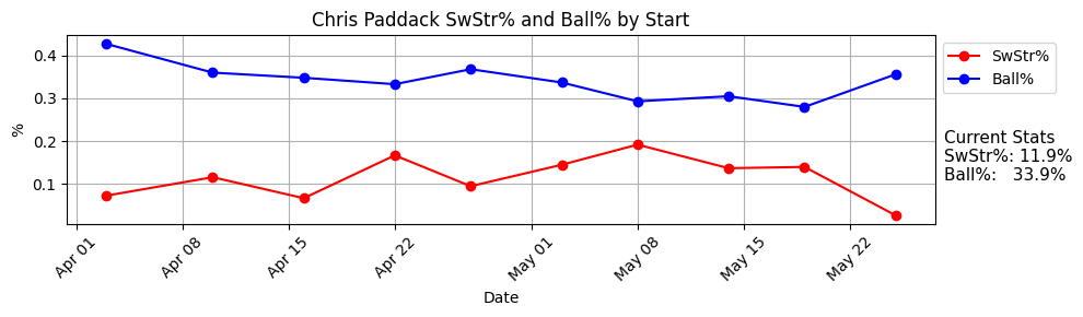 That start did drop him under 12% SwStr% and 47% Strike%, so it’s tough to call him an above-average pitcher, but he probably gets there just because he doesn’t walk many hitters and has decent command in the strike zone.