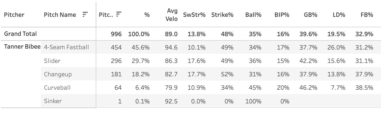 Seems like Bibee should have had a few more strikeouts than that with the 20 whiffs he recorded. He has been very good lately and has the SIERA down to 3.55 while the ERA is above that at 3.99. The season K-BB% of 18.3% is strong but definitely not where you really want it to be, but you have to be feeling pretty good about Bibee after that slow start.