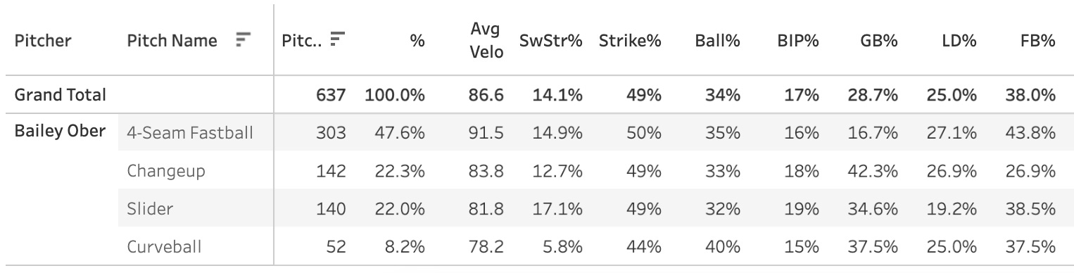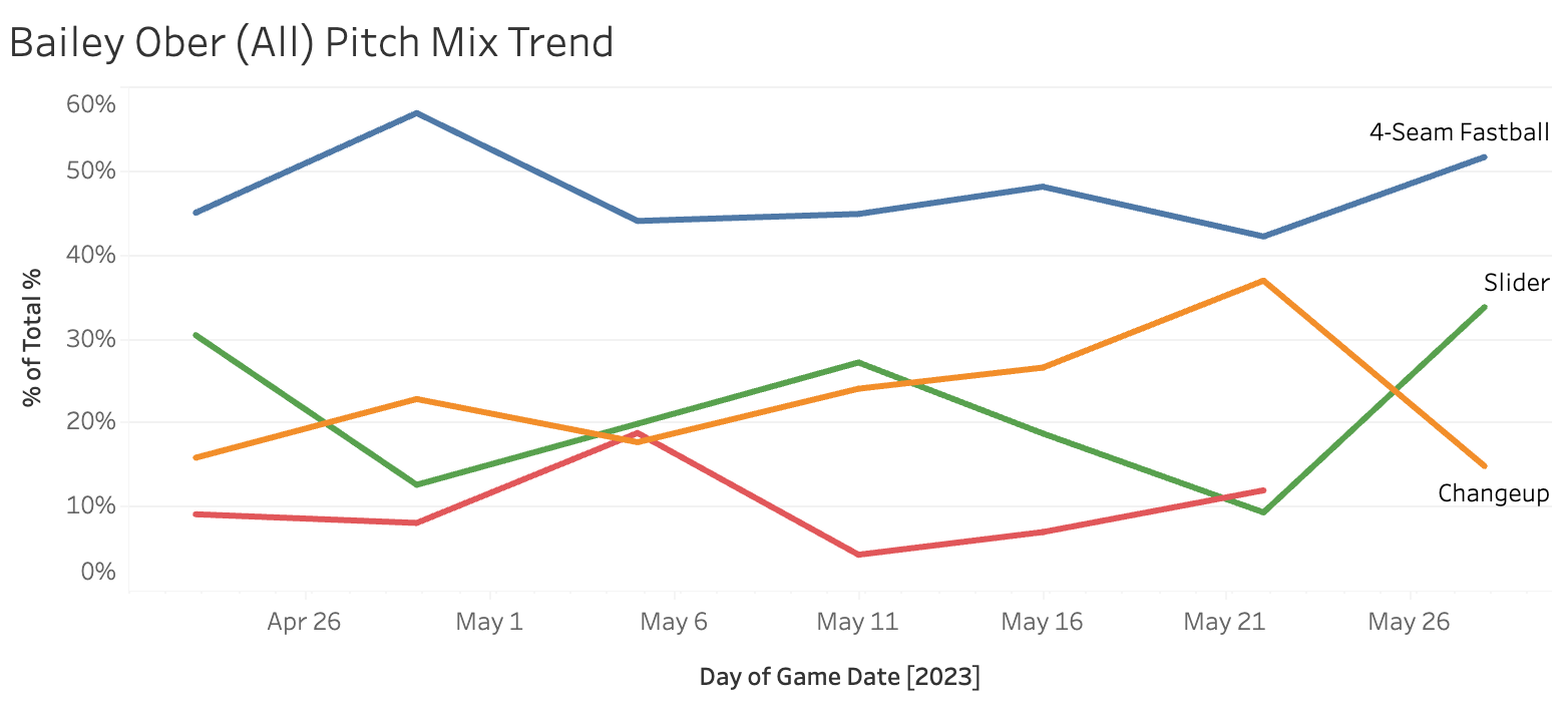 Bailey Ober's SL usage (33.7%) up 11.7 points
