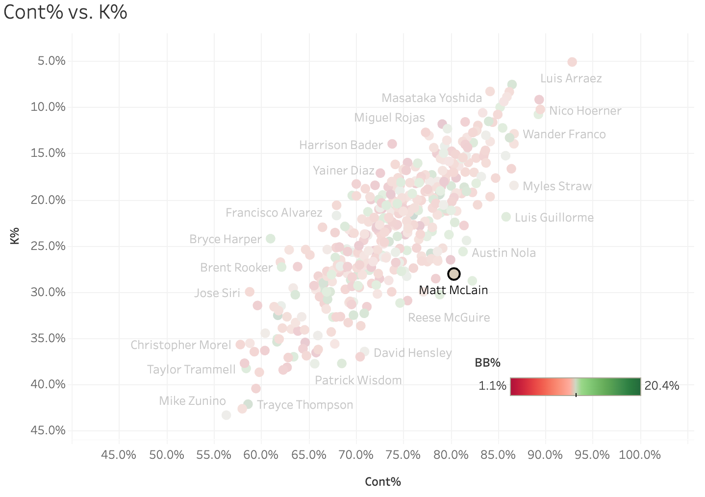 Matt McLain is now up to an 80% contact rate with a rapidly descending 28% K%.