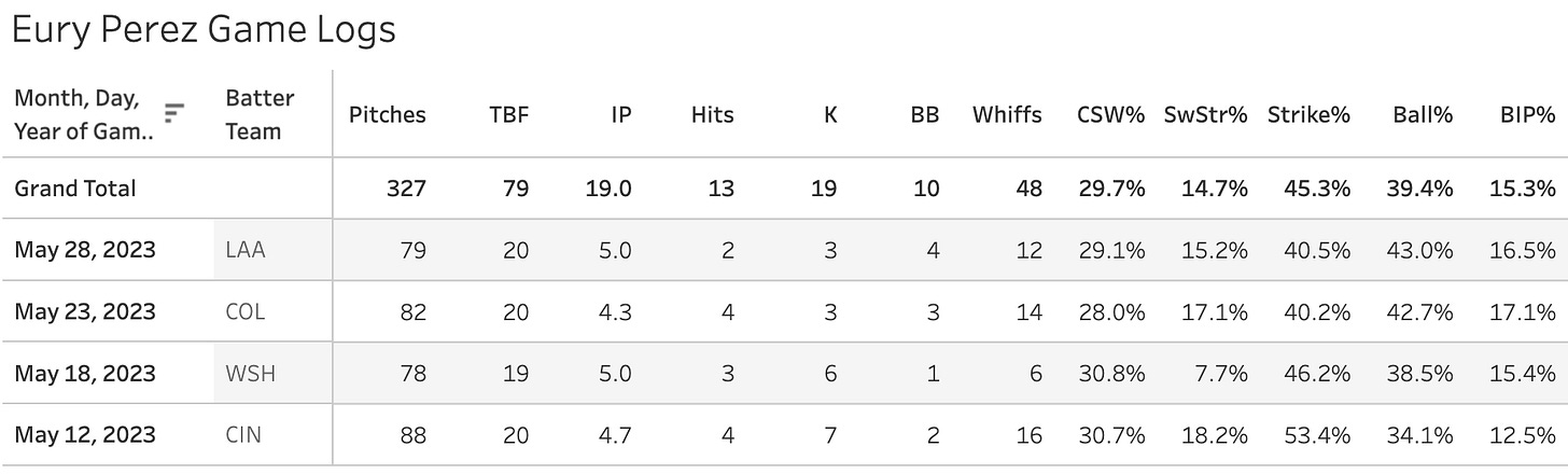 MacKenzie Gore was insanely good yesterday with a 21.7% SwStr% and a 58.8% Strike% - that’s ridiculous stuff. Seven innings, three hits, one run, eleven strikeouts, and just ONE walk. He’s improved to a really strong 29.8% K% and an 11.3% BB%. Since April 26th he’s at a 30.2% K% and an 8.6% BB% - so he’s been an ace this year and one of the few bright spots for the Nationals.