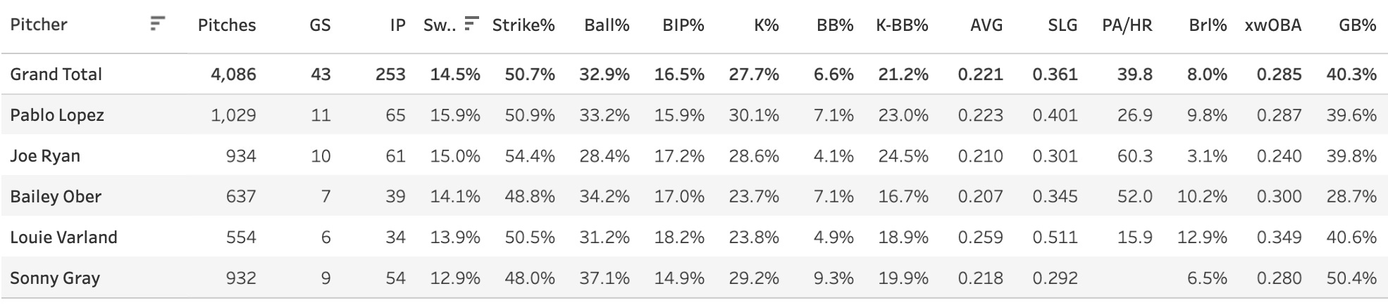 Braxton Garrett - 87 TBF, 28.7 K%, 6.9 BB%, 43.6% GB%