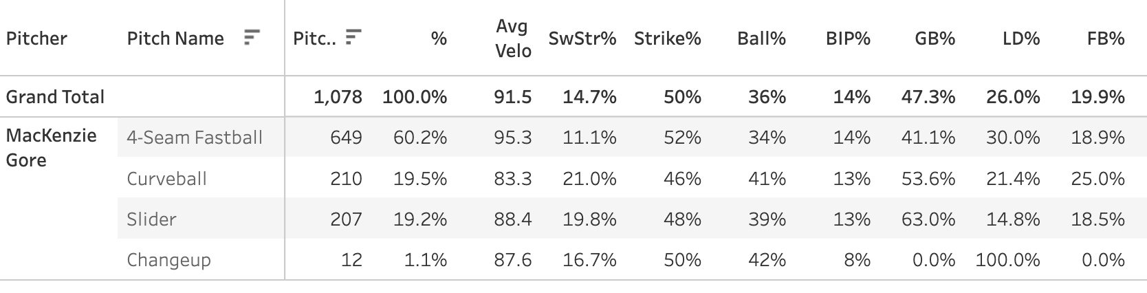 1. MacKenzie Gore (WSH): 58.5 Strike%, 29.2 Ball%