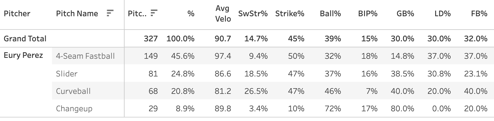 8. Eury Perez (MIA): 12 Whiffs (79 Pitches)