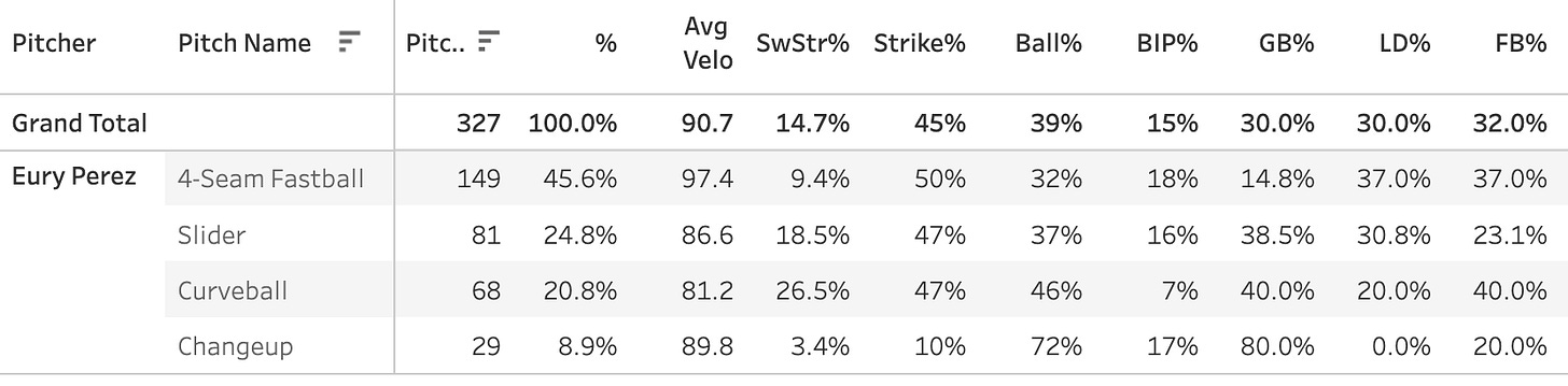 Another hot fastball that isn’t overwhelming hitters. It’s not a terrible SwStr% but that’s below average and not what you want to see from a guy that is pretty dependent on the pitch. It’s also been hit in the air a ton, which you really don’t like to see.