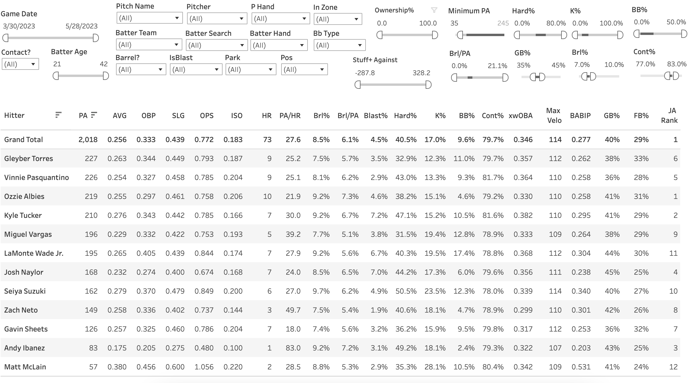 But in May, he has a ridiculous 12% Brl/PA with a .277/.360/.462 line and a .419 xwOBA. Those are both top-15 in the league, so I would think the slash line will continue to improve as we move forward.