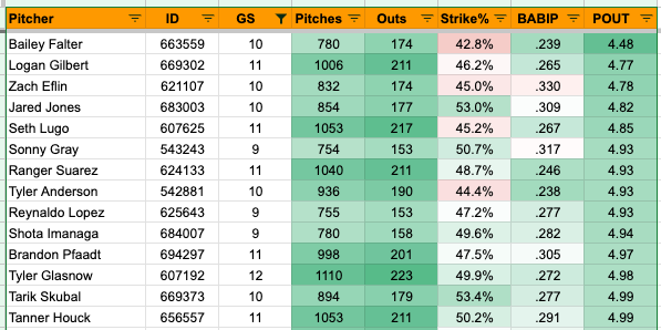 4. Tyler Glasnow: 92 Pitches, 21 Outs, 4.38 POUT