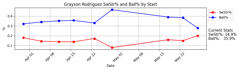 What we should do here is look at that 14.8% SwStr% and 34% Ball% and project from there, because we have seen 708 pitches from him so far. Who knows if he can stick around those numbers, but if he does, it should be quite good. Some other names between 14-16 SwStr% and 33 and 35% Ball%: