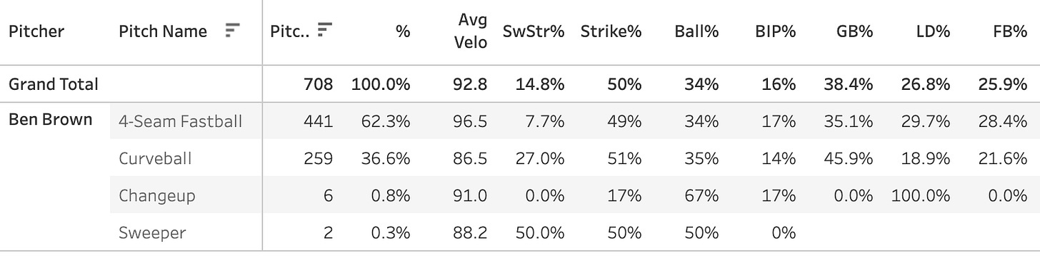 I don’t know if I’ve ever seen a starter only throw two pitches, usually you’ll see a changeup or cutter or something thrown in there 5% of the time, but nope Brown is just going wild on the four-seamer and curveball. Given that the four-seamer does not seem like a good one, I would really doubt he can function as a useful fantasy starter moving forward. He is likely to face the White Sox next week, so that might be worth a stream, but yeah I wouldn’t go out and drop anybody good for him right now.