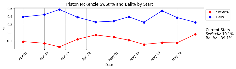 Triston McKenzie struck out nine in Coors Field on an 18.1% SwStr% and 33% Ball%, so that rollercoaster continues.