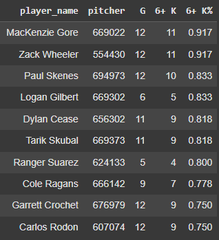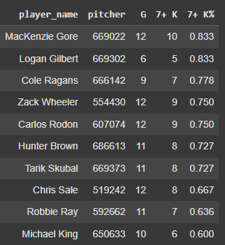 If we do 7+ strikeouts, only Logan Gilbert matches his ratio, but that was in half of the sample: