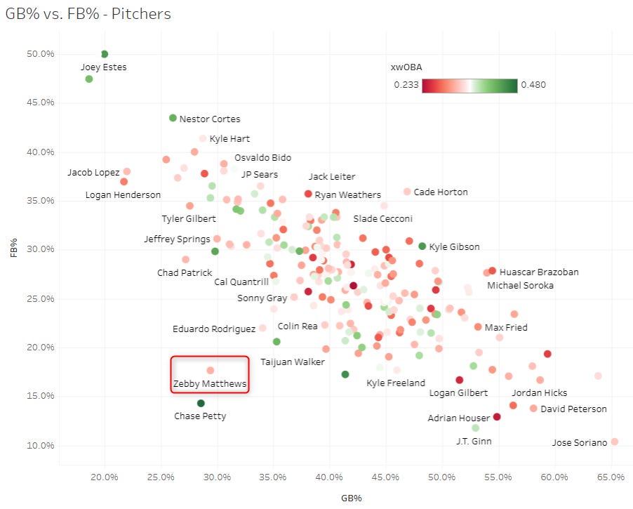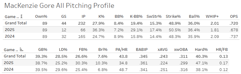 He’s not allowing many balls in play with that 36% K%; that’s the main point. But when hitters are getting to it - they’re hitting it hard. But honestly, those two numbers (10.3% Brl%, .361 BABIP) are more likely to improve than anything else - so it’s even better news for Gore in my book.