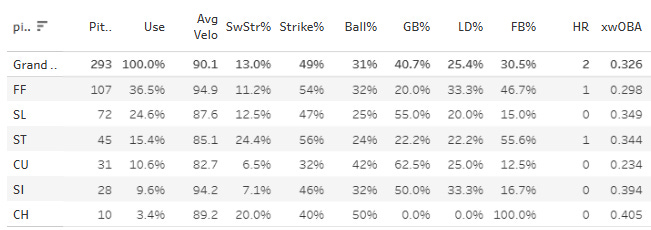 He has a very deep pitch mix with a 95mph fastball that has returned good marks on 107 offerings so far. The slider/sweeper combo behind it seems to work well, and he just has a lot of other options to throw at people if things aren’t going super well.