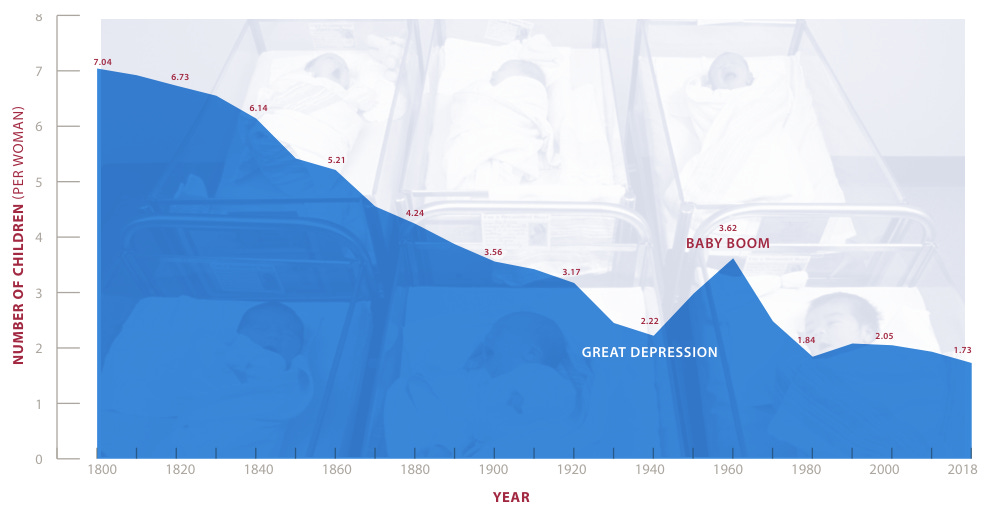 There’s a family on my street with eight kids (yes, they are Catholic), and this week the mother asked my wife if my wife could watch the three youngest so she could go help at her older kids’ school for the last day of school activities. And my wife said yes. So there are six kids running around my house right now, it’s a mad house. Amazingly gracious move from my wife to help out like that, shout out to her. As for the eight kids thing, it’s funny to me that typically people will react to that in a very negative fashion even though that kind of family size was not abnormal at all until like five minutes ago (aka like 75 years ago). I found this plot which is interesting: