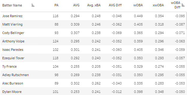 Anthony Volpe - 89 PA, 0.371 wOBA, 0.294 xwOBA, -0.077 Diff