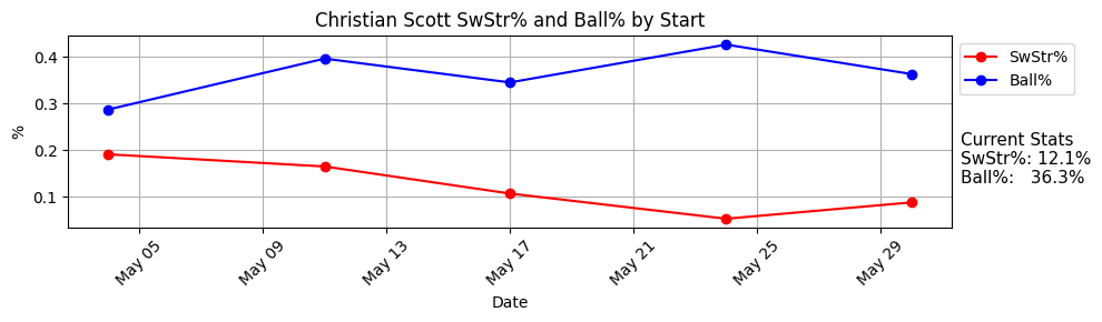 I have felt worse and worse about Christian Scott every start since his second one, and last night didn’t help. He only gave up two runs in five innings, which you’ll take in real life, but the whiffs and strikes have just been mediocre overall now even with that great debut he made. I don’t think Scott is a 10-team pitcher now, but in 12-teamers or deeper you probably can wait a bit longer to see what happens, we’re talking about a 454 pitch sample size.