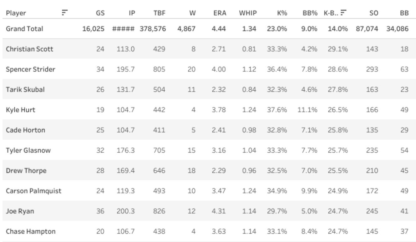 But with this dashboard I have we can go back to say, 2021-2022 and see the pitchers with a K-BB% above 25% in the minors and see what has happened to those guys.