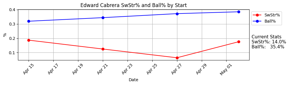 There go the walks! It took your boy 91 pitches to get through four innings. Remember after that first start we were like yooooo Edward Cabrera just put up a 31.9% Ball!!!! Well, since then, that has gotten worse every single start: