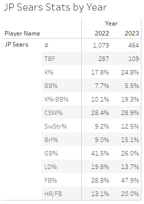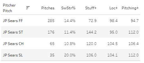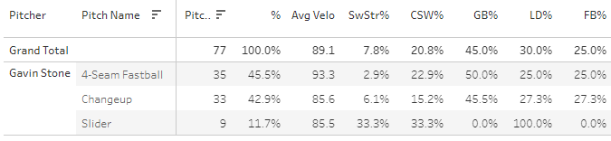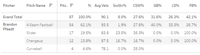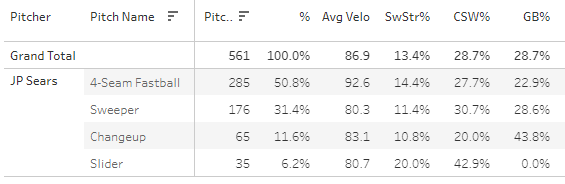 He had a 17.2% SwStr% and a 40.2% CSW%, so yeah that was actually one of the best CSW performances of the entire season. Pretty wild! The updated pitch arsenal breakdown:
