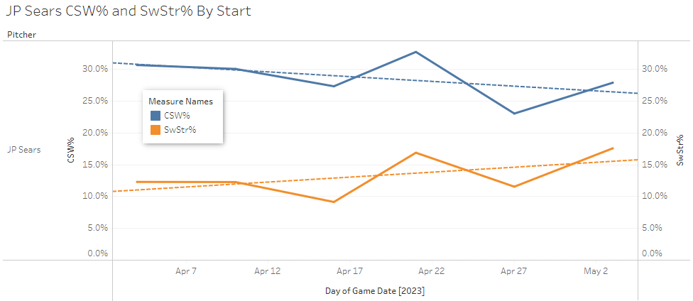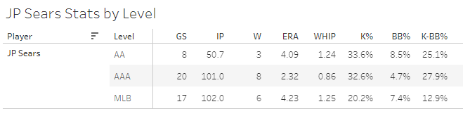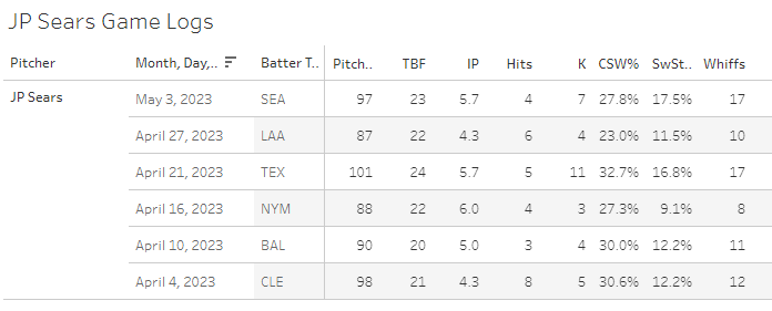 2. JP Sears (OAK): 17 Whiffs (97 Pitches)