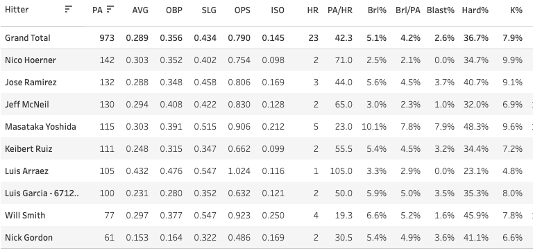 Of those hitters, Gordon has the fourth-best barrel rate, and the hard-hit rate is at least over 40% so he’s just not slapping the ball into play like Luis Arraez does. Hold strong on Gordon, there should be better days ahead.