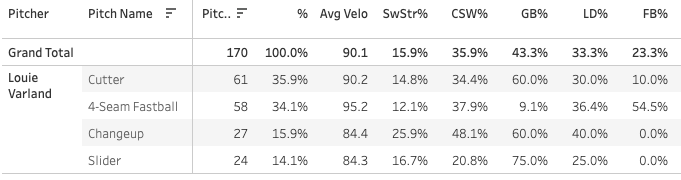 Louie Varland - 47 TBF, 29.8 K%, 6.4 BB%, 43.3% GB%