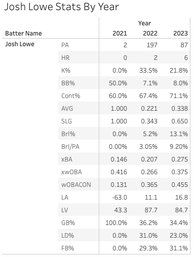 Josh Lowe hit the hardest ball of his career last night just annihilating a homer run. His numbers are great right now: