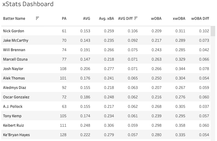 One of my most-drafted players this year was Nick Gordon. He’s off to a miserable start slashing .153/.164/.322, but wait, hold on! He has the largest gap between his batting average and expected batting average in the whole league: