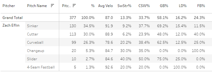 Everything looks pretty darn good for Eflin if we go back to the pitch mix. He has the fastball variations that get ground balls and then the curveball which has been very good, and he also has a changeup to mix in there. Pretty impressive stuff, the Rays have done it again. I doubt he’s available in your league, but if he is - you know what to do!