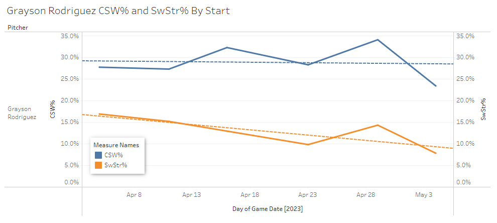 Grayson Rodriguez was bad yesterday. He got just six whiffs and gave up three homers on four barrels with a 23.4% CSW%. That was his worst start of the year.