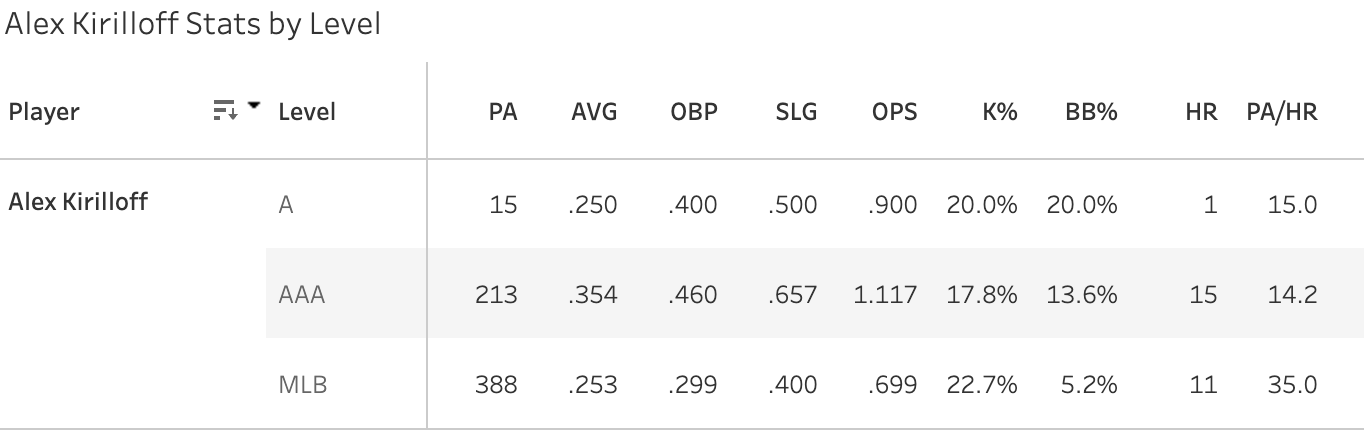 Alex Kirilloff is back in the Majors, and he is someone that should be picked up. Here’s his last three seasons’ worth of stats broken down by level: