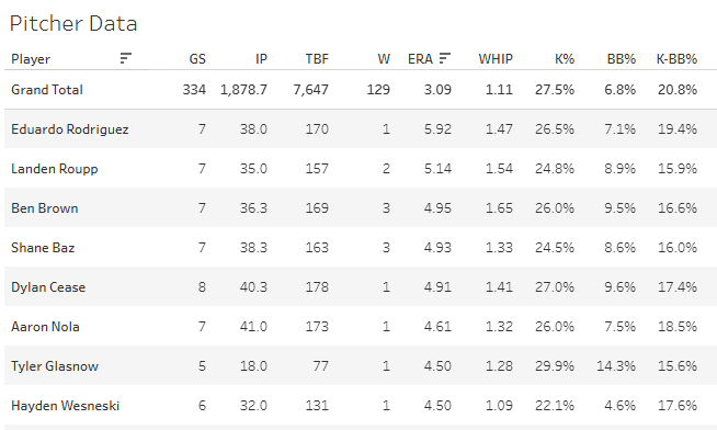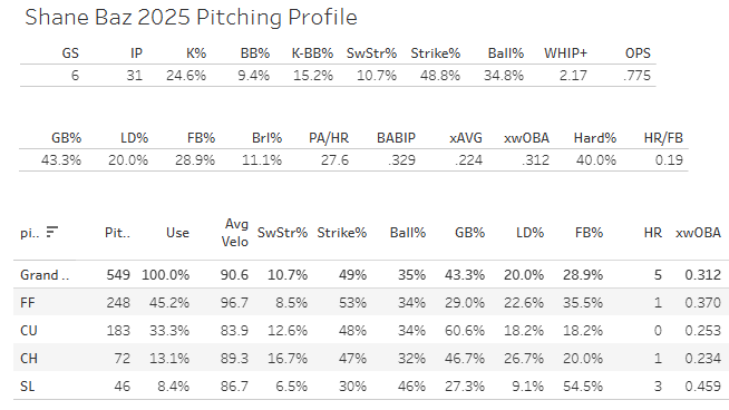 7 GS, 36.1 IP, 4.95 ERA, 1.65 WHIP, 26.0% K%, 9.5% BB%