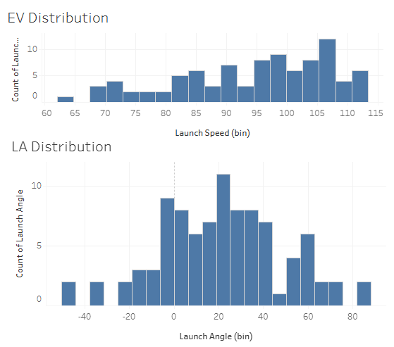 The son of Matt Kemp! How about that. The immediately red flag is that K%. And it gets even worse when you see that the contact rate is at 65.5%. So the only way he would have much of a chance at success in the Majors (this year, at least) is if he hits the ball super duper hard. And he does! The EV90 is 108, the max is up there at 113.