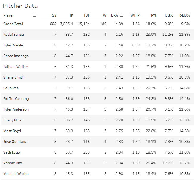 6 GS, 36.1 IP, 1.73 ERA, 0.99 WHIP, 31.7% K%, 5.5% BB%, 18.4% SwStr%