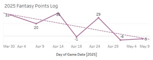 It would seem he’s ready to go! The Snakes just don’t have a clear spot for him to play with how well Geraldo Perdomo has been playing. I do think Lawlar will get most of his fantasy value from steals when he does arrive. The raw power isn’t anything special (10.6% Brl%, 103.7 EV90), and the strikeout rate is in the danger zone with a mediocre 77% Contact%. Now, a 23% K% and a 77% Contact% would work just fine in the Majors, but we cannot expect those numbers to translate from AAA to MLB. They’ll both likely get a lot worse. So a guy with a 27% K% and poor EVs isn’t a great bet. But the steals should be there, and the power potential is certainly there. He’s not a Jacob Wilson / Chandler Simpson type by any means.