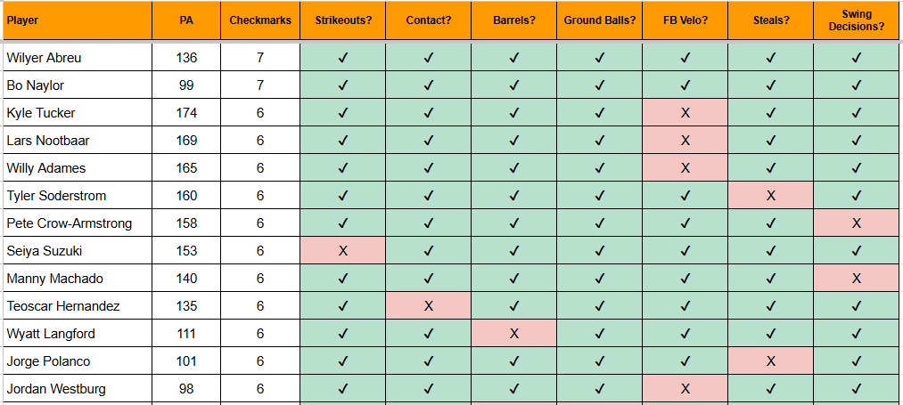 An even better quick resource to pick out interesting hitters is that Player Checklist I developed last year. This looks for well-rounded hitters in three areas