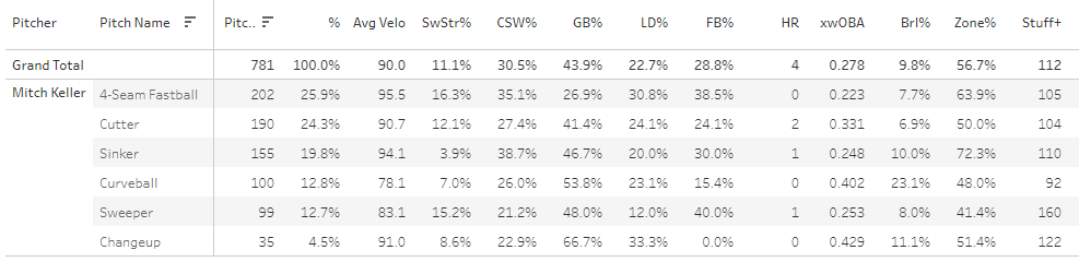 That’s just a beautiful pitch mix. Don’t get me wrong, I would really like for the SwStr% to be a couple of points higher, but there’s more than one way to skin a cat and Keller has been skinning a lot of cats this year.